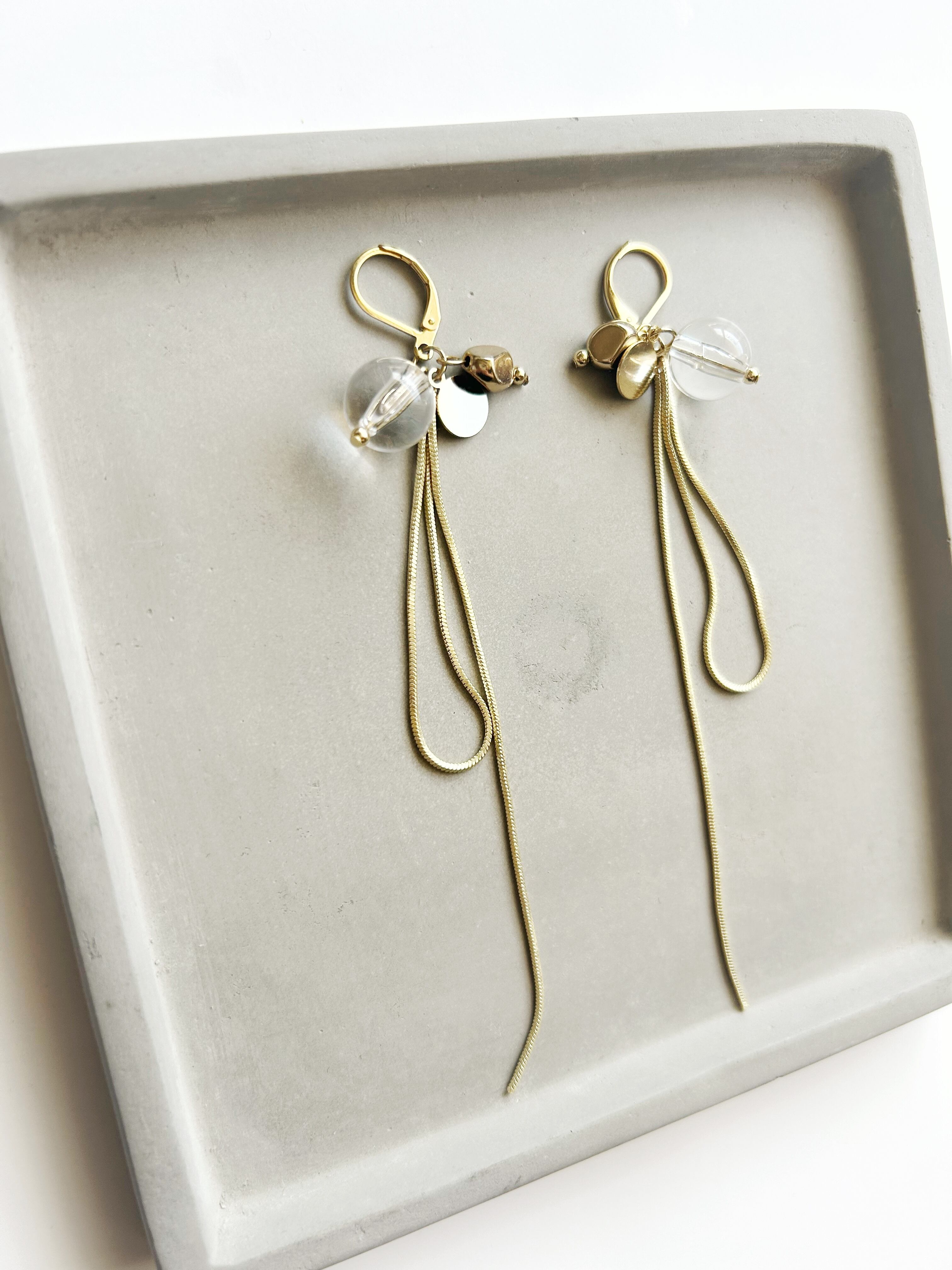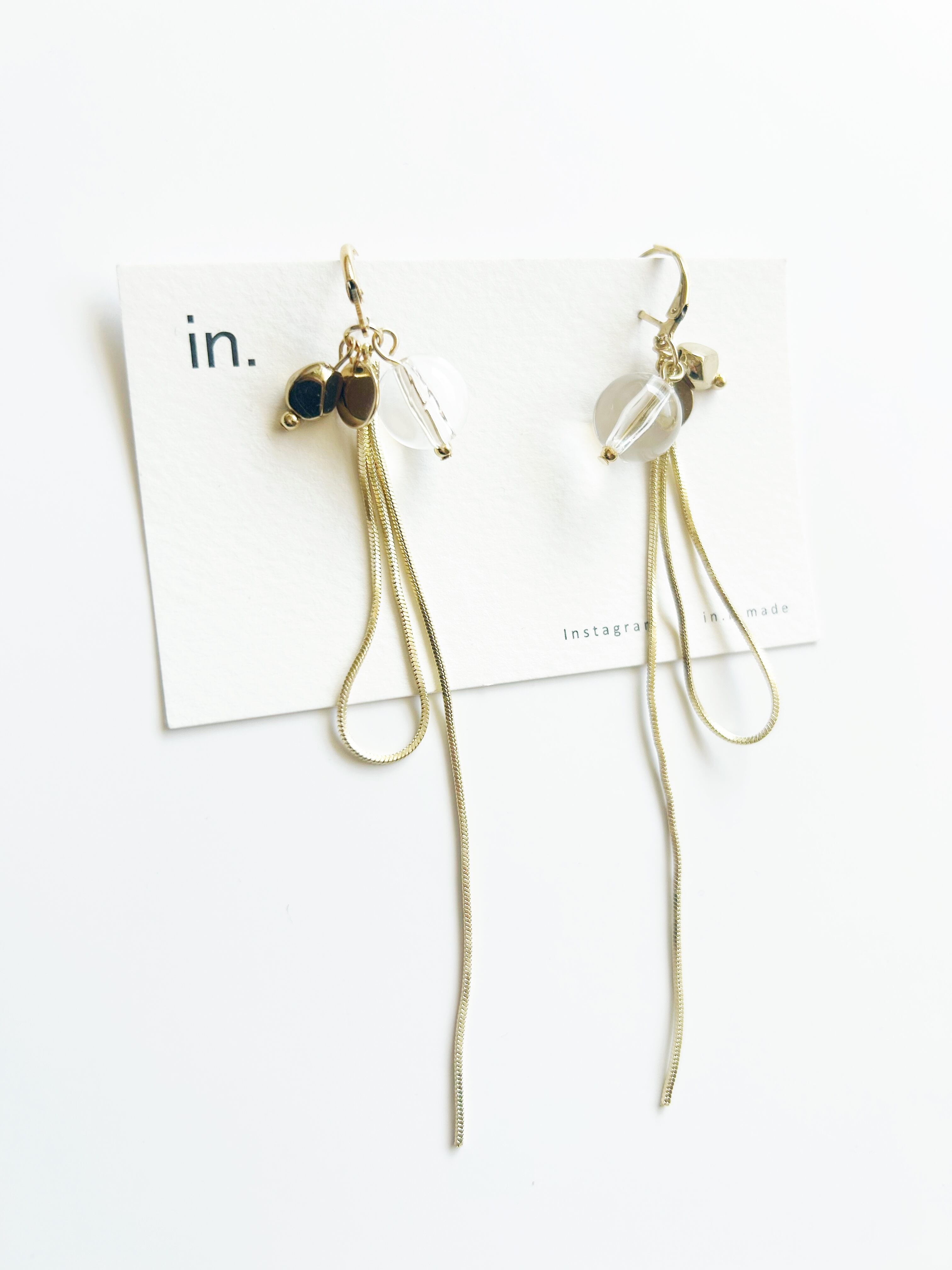 ゴールドのロングチェーンにクリアパーツを施すことで、揺れるたび光の反射が美しくシンプルながらも、存在感を感じます。